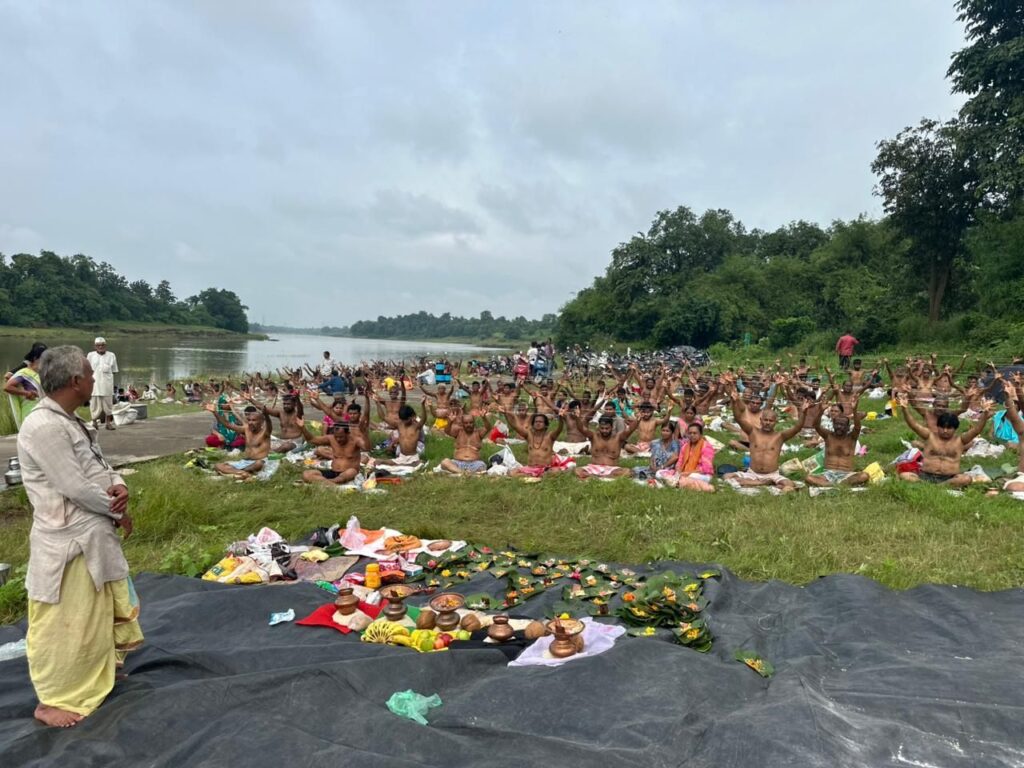 ખેરગામ : પિતૃપક્ષના પવિત્ર અવસર પર ખેરગામ નાં નાંધઈ ગામના વેદાશ્રમ ખાતે ઔરંગા નદીના કિનારે સામૂહિક નારાયણબલિ શ્રાધ્ધ વિધિનો 56મો વર્ષ નિર્વિઘ્ને અને ભવ્યતા સાથે પૂર્ણ થયો. અર્પણ, તર્પણ અને સમર્પણના સદ્દભાવ સાથે યોજાયેલી આ અનોખી વિધિમાં મોટી સંખ્યામાં ભાવિકોએ ઉપસ્થિતિ નોંધાવી હતી.